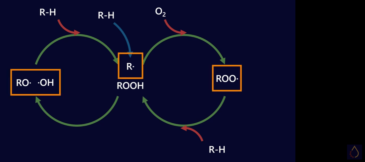 Esse hidrocarboneto pode gerar diversos subprodutos, como água, álcoois e ácidos. A geração destes formam um ciclo como se pode ver abaixo: